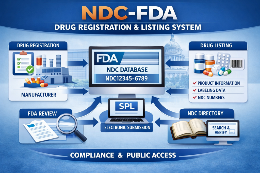 The NDC US FDA Drug Registration and Listing System is a regulatory mechanism used to document and identify drug products that are legally marketed in the United States. Overseen by the U.S. Food and Drug Administration, this system enables regulatory monitoring of drug manufacturing, labeling, and distribution activities. Compliance with US FDA drug establishment registration and drug listing requirements is mandatory for all companies involved in commercial drug operations intended for the US market.